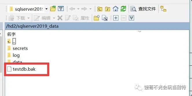 上一回我们启动docker容器的时候使用了-v参数挂载了本地目录/hd2/sqlserver2019data到容器内目录/var/opt/mssql,所以我们只需要把文件testdb.bak上传到/hd2/sqlserver2019data目录,docker容器即可访问。