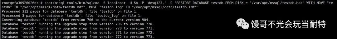 /opt/mssql-tools/bin/sqlcmd -S localhost -U SA -P 'dev@123,' -Q 'RESTORE DATABASE testdb FROM DISK = "/var/opt/mssql/testdb.bak" WITH MOVE "testdb" TO "/var/opt/mssql/data/testdb.mdf" , MOVE "testdb_log" TO "/var/opt/mssql/data/testdb.ldf"'