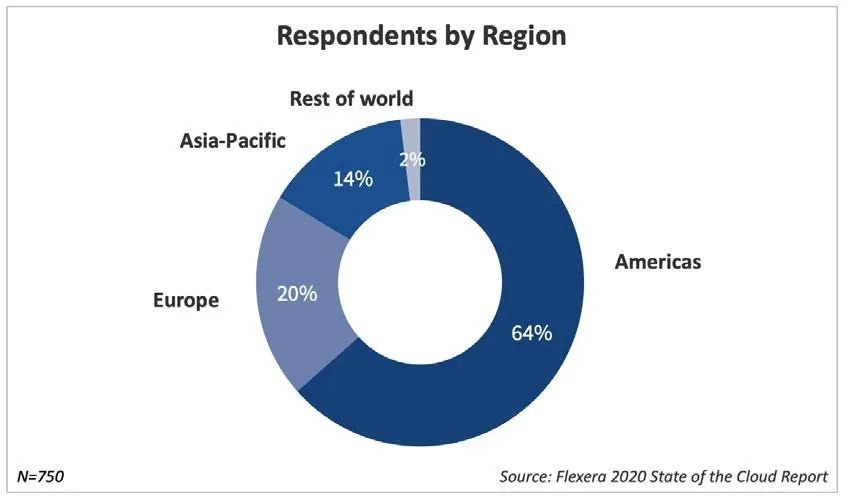 这份报告里总体上提出了关于2020年云状态的11个观点。调研样本750个,总体上还不错,行业包括软件,高科技,金融,医疗等等;64%的调研对象来自于美洲,欧洲20%,亚太只有14%,只有澳大利亚,印度,日本,新加坡和韩国。这份报告不能很好地体现中国市场的情况也很正常。