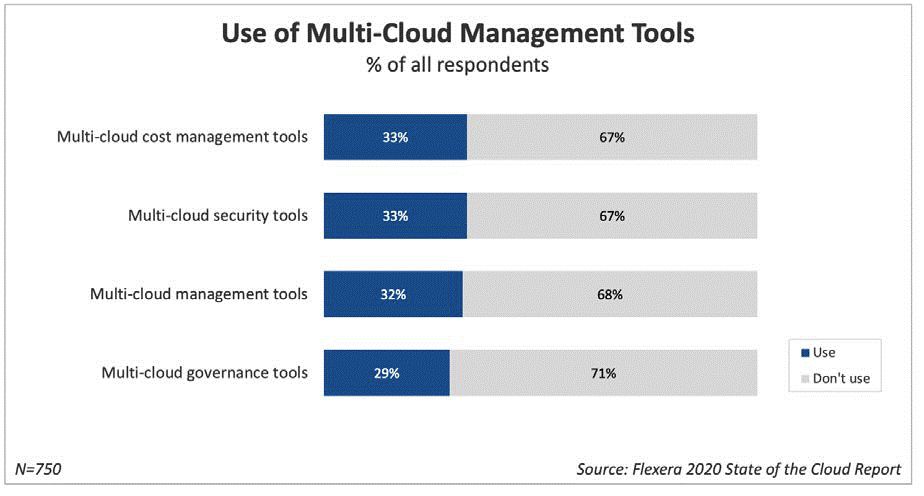大部分的观点和我的直觉一致。我想重点谈谈第三点:“大多数的组织都不在使用多云管理工具”。在一点上和很多人的看法有分歧。首先,我同意这个观点,在中国市场上使用多云管理工具的公司不占多数。关键是未来会如何发展。很多国内的公司和研究报告,都认为这将会是一个巨大的市场,我倒是不敢苟同,多云管理工具是锦上添花的东西,而非雪中送炭,虽然需求不少,但是产出有限。Gartner的报告里认为,这个市场到2023年也只有5亿美元左右。
