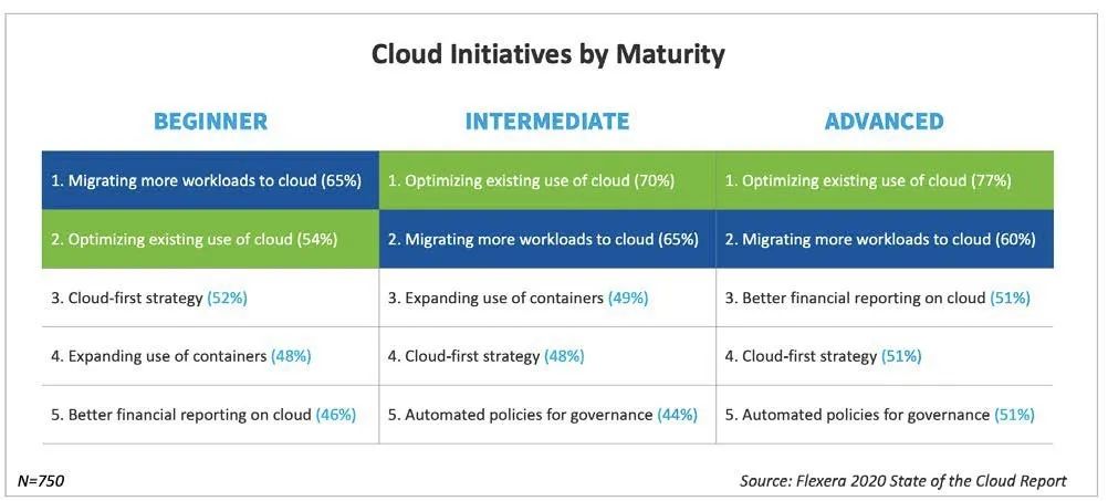 对他们而言,云迁移已经不是重要的挑战了,安全,支出,治理和专业知识才是。在中国,我认为这个排序可以调整一下,迁移,多云,专业知识可能是比较重要的挑战,而安全,治理,支出阶段还没有到,类似于2015年RightScale报告里的情况。