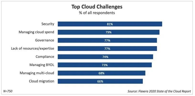 按照调研结果,云上面领的挑战排序如下:安全,管理云支出,治理,缺乏资源和专家,合规,管理BYOL,管理多云,云迁移。