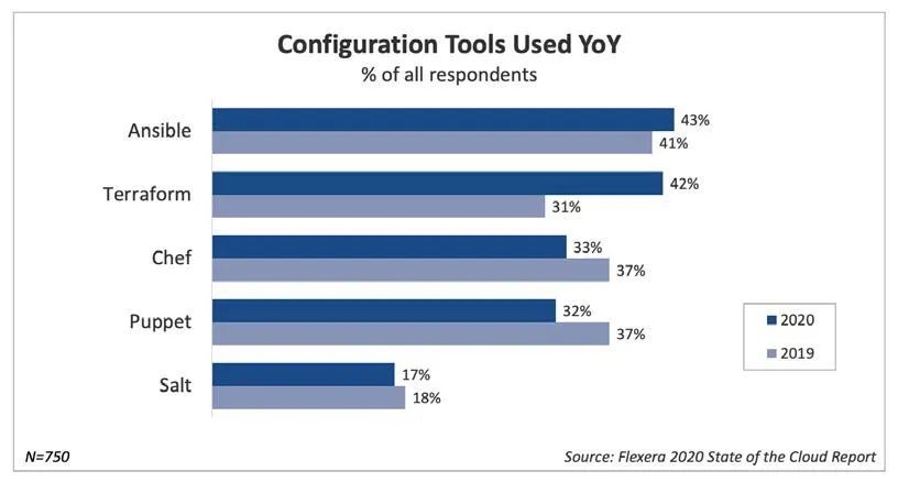 和去年相比,Ansible和Terraform的使用者增加了,而Chef,Puppet和Salt减少了。更多企业使用Ansible,而中小企业使用Terraform。