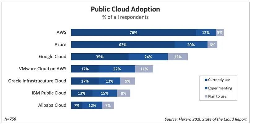 这张图很有意思,AWS,Azure和Google还是前三强,阿里云居然进入了视野,说明全球也有开始使用阿里云的客户了。