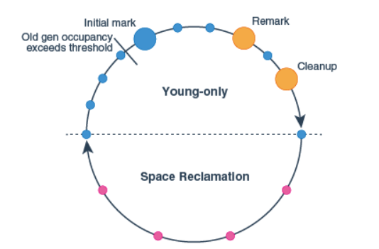 初始标记:这个过程除了普通的 young-only GC 外,还会开始并发标记过程,这个过程决定了被标记的老年代存活对象在下一次space-reclamation阶段会被保留。这个过程不会STW,有可能标记还没有结束普通的 young-only GC 就开始了。这个标记过程需要在重新标记(Remark)和清理(Cleanup)两个过程后才能结束。