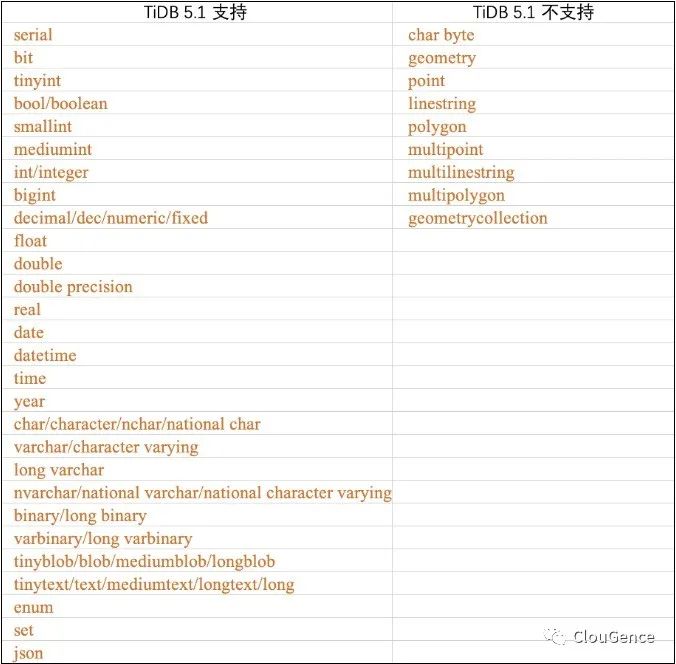 TiDB 对于 MySQL 协议兼容做得不错(4.X 版本),但是其中也有瑕疵点,对于数据迁移同步来说,关注 2个方面的信息:数据类型、DDL支持层面。