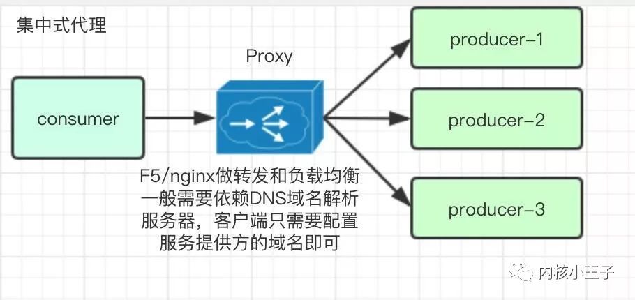 集中代理模式一般是在服务调用方和服务提供方之间部署一套独立的代理系统来接收调用方的请求,然后配合域名系统和特定的负载均衡策略以及路由算法,转发到对应的服务提供方,这个代理系统一般由硬件F5设备加7层软件负载nginx配合域名系统来使用,这种模式,有集中治理,运维简单,而且和语言栈无关的优点,但是目前这个代理系统存在单点问题,而且配置比较麻烦,由于服务调用者没有之间调用服务提供方,所以网络上存在多一跳的开销,目前国内主要有携程等公司在使用