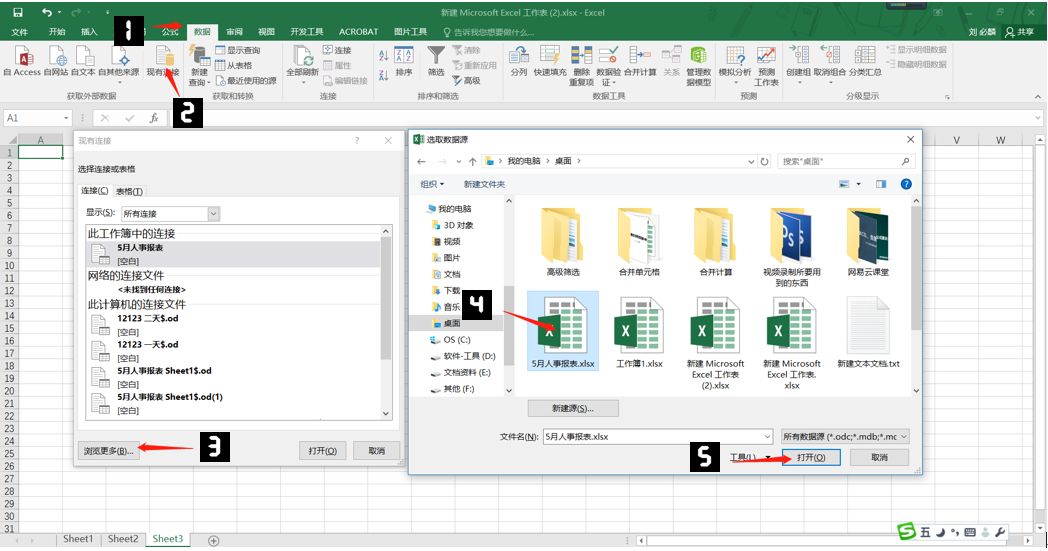 步骤1 依次单击【数据】-【现有连接】,在弹出的对话框中选择【浏览更多】,然后找到源文件“5月人事报表”,然后单击【打开】。如下图: