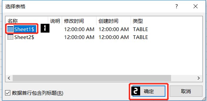 步骤2 在弹出的对话框中选择"Sheet1$",然后单击【确定】。
