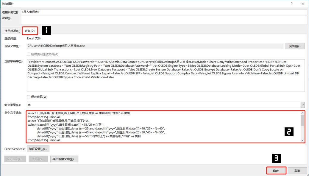 步骤4 在弹出的对话框中选择【定义】,然后在【命令文本】里输入SQL语句,然后单击【确定】,在弹出的对话框中继续单击【确定】。如下图: