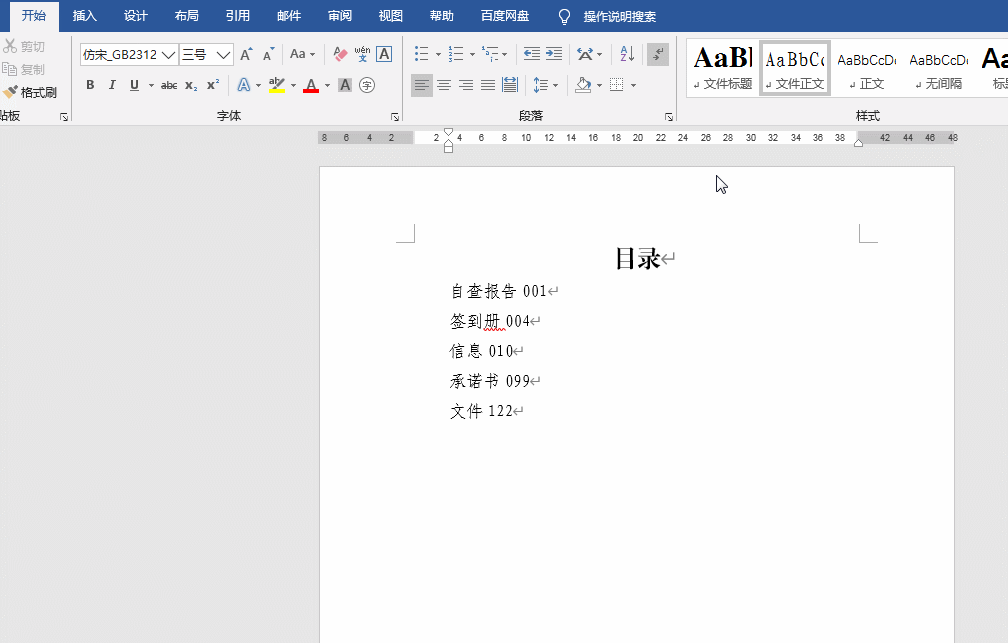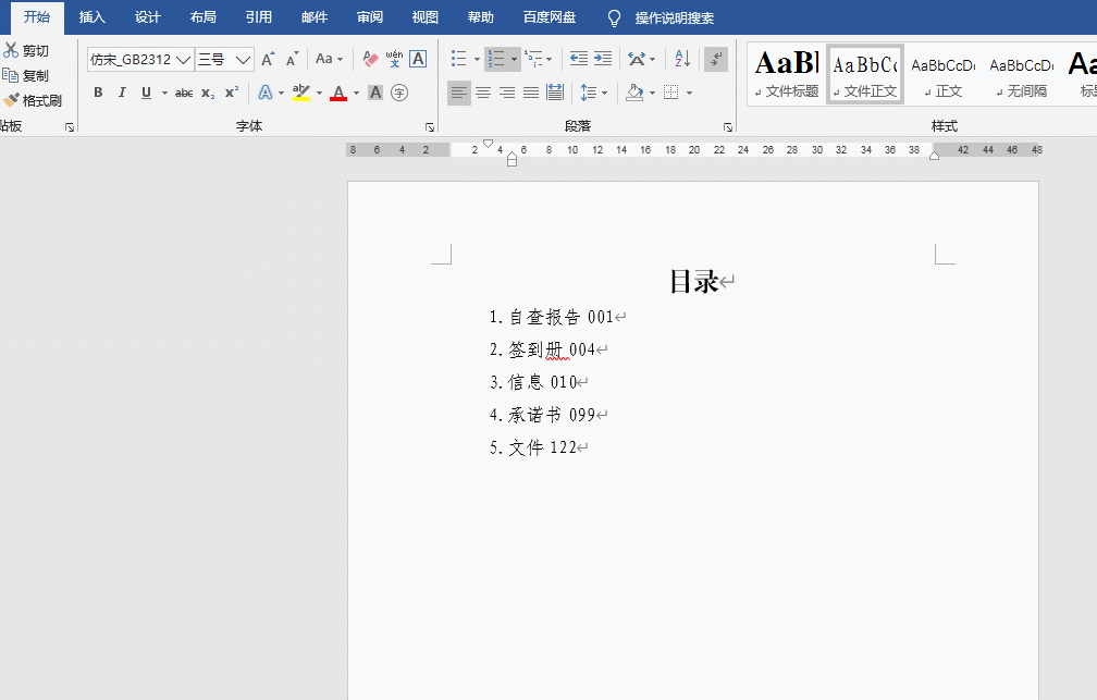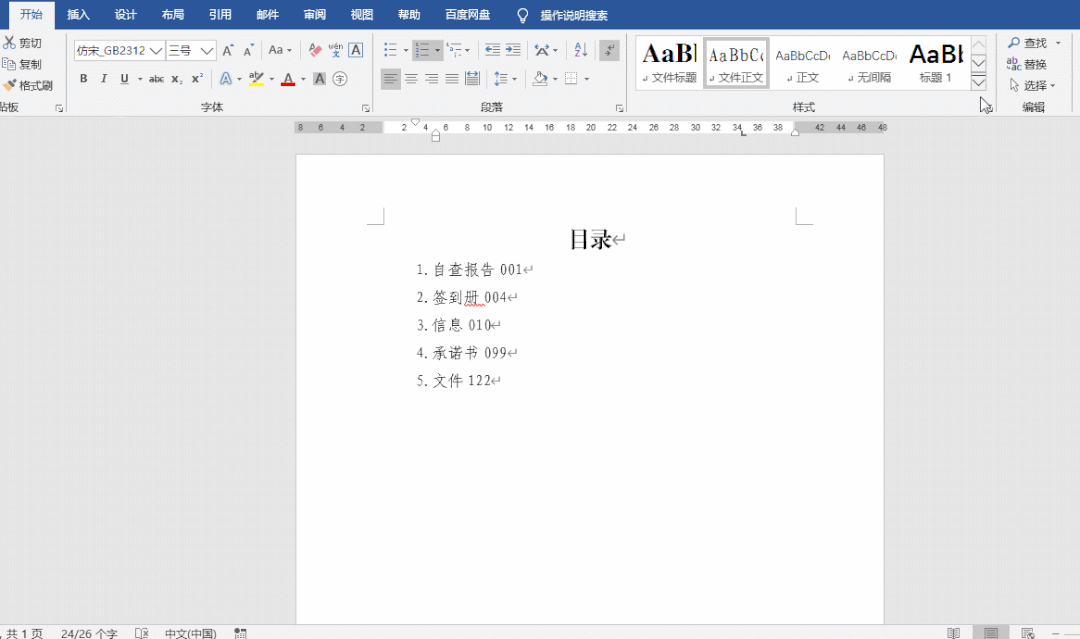 1.全选出“目录”两字的内容,在【开始】选项卡中的【段落】功能区中选择【编号】,选择一个合适的“编号样式”。