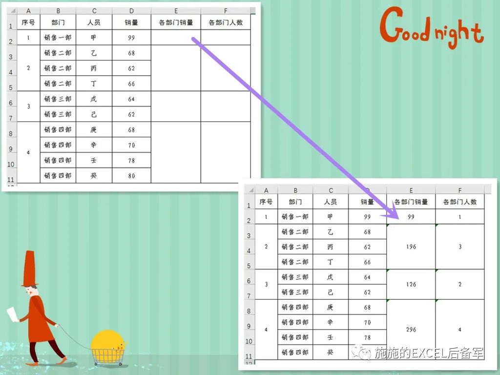 3. SUM(E3:$E$12)部分比SUM(D2:$D$11)部分多选一行是防止最后部门只有一个人时而导致循环引用。