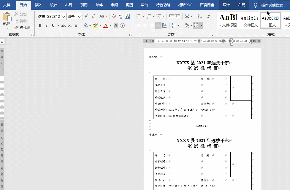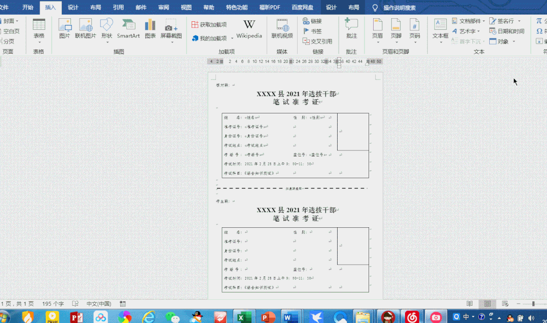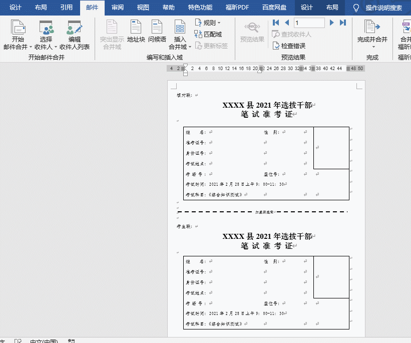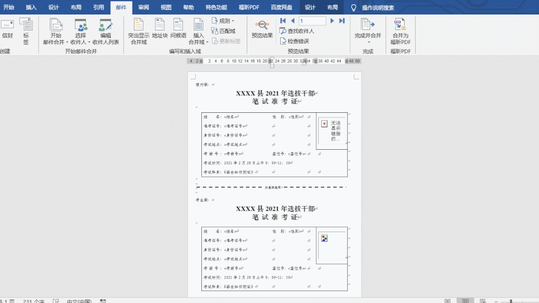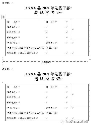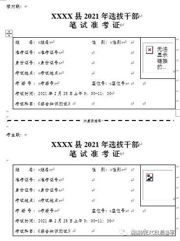 【备注】因准考证前期格式没有调好,导致插入【域】后【骑缝章】处出现位移,需要调整。(过程略)
