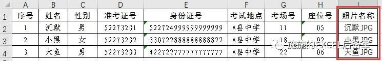 在I列添加一行辅助列,在I2单元格输入“=B2&”.JPG””,并向下填充。填充完毕后转为文本。效果如图3。