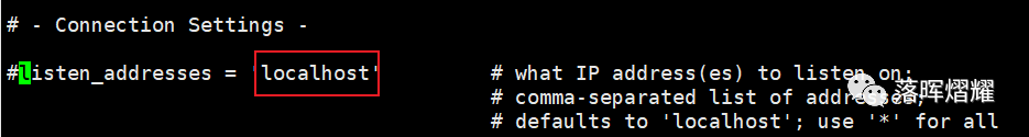vi postgresql.conf,取消注释,并改成指定的ip地址,个人测试可以改为 ‘*’。查找命令:/listen :
