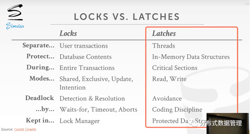 事务并发中的死锁一般可以有特殊的处理机制,而多线程下latch由于线程之间相互不了解操作内容,尽可能代码层面避免死锁的发生.