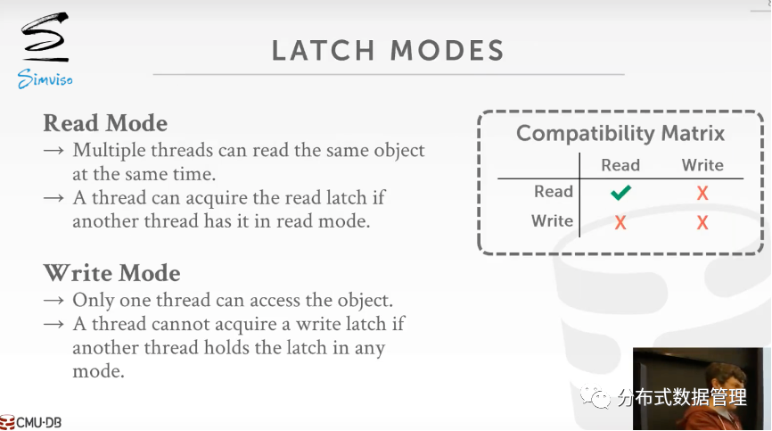 一个数据最多能被加上一种类型的latch锁,多个线程可以同时对数据加上读锁. 写锁只能加在没有上任何锁的数据上,一个数据只能被加一个写锁.