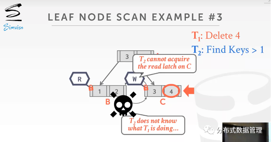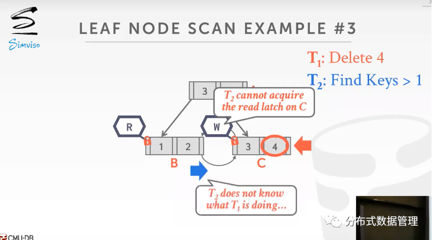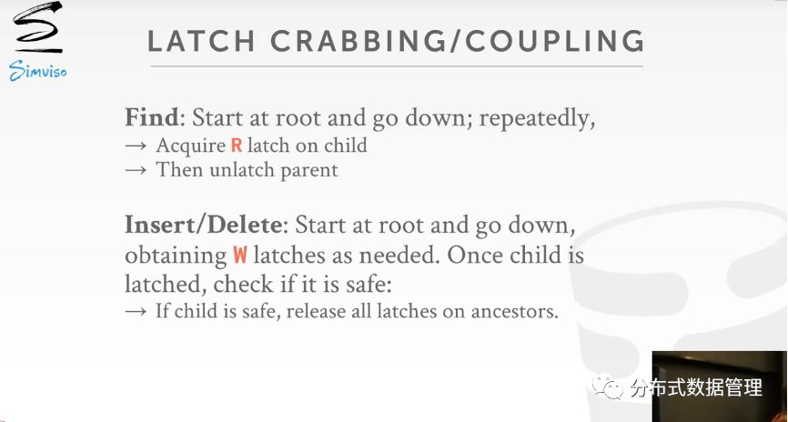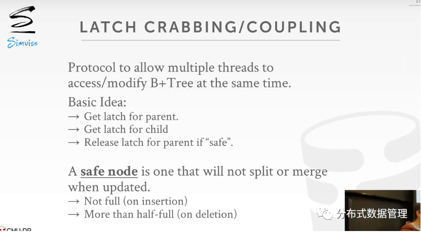 B+树通过Crabbing/Coupling技术处理上述问题. 基本的想法是每个线程首先获取父节点的锁,随后获取子节点的锁,如果确保释放父节点锁是“安全的”,那么才释放父节点的锁,Andy形容这像螃蟹走路(形象!不过后面会发现有时候需要腿很长…).