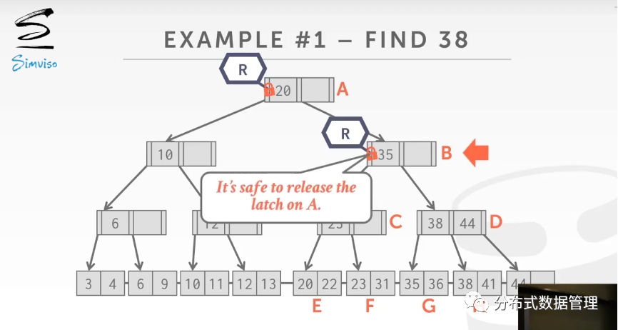 下图是从B+树中查找Key为38的数据,当线程获取了子节点的读锁后直接释放父节点上的读锁.