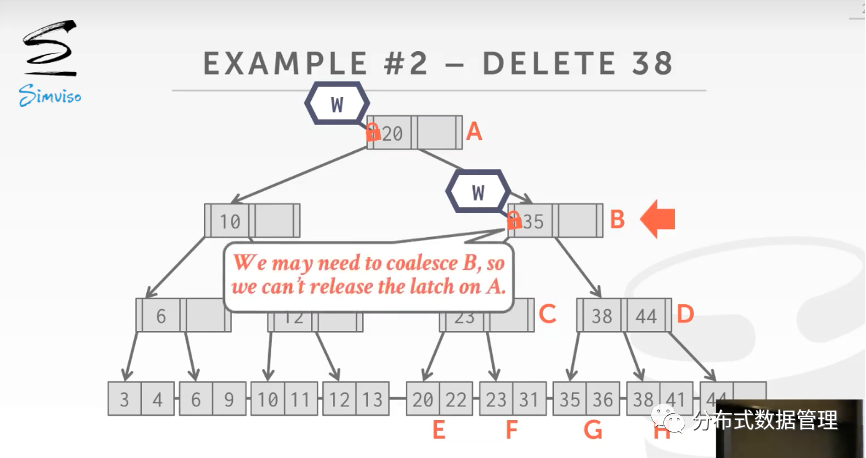 下图是从B+树中删除Key为38的数据,由于节点的删除可能导致节点的合并,继而影响父节点发生. 由于线程获取节点B的写锁之后不能确保删除操作不会导致节点B发生变化,因此B上的写锁暂不释放.