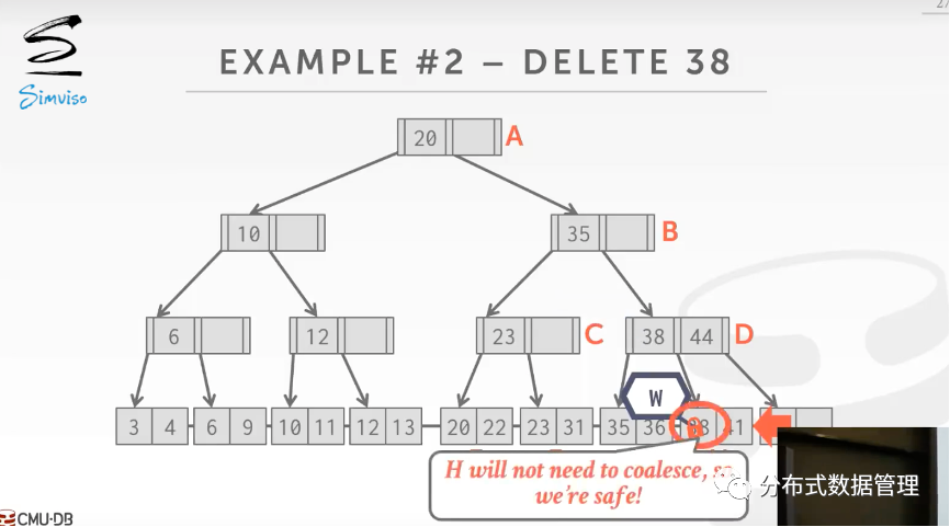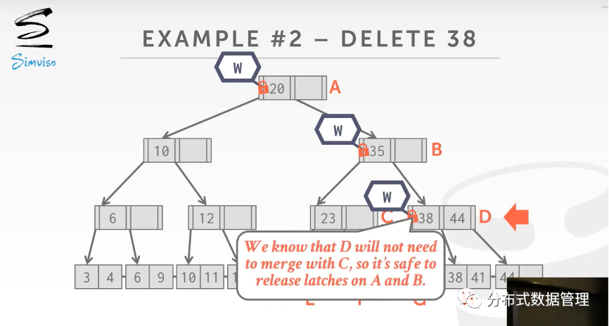 当线程获得节点D的写锁,读取D的数据后可以确认删除38不会导致树的合并(假设此时树中节点允许的最小Key个数是1),这时候释放A和B上的写锁.