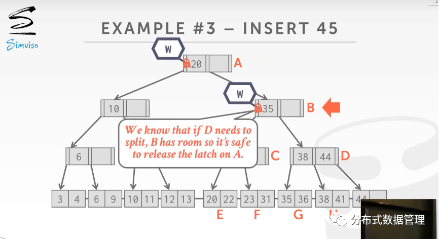 插入操作也是类似的处理方法,线程只有能够确保新节点的插入不会导致节点的分裂才会释放父节点上的写锁.下面是向B+树种插入Key等于45的例子. 当线程拿到节点B的写锁时发现B中有预留空间,因此插入新数据不会导致节点B的分裂,线程释放A上的写锁.