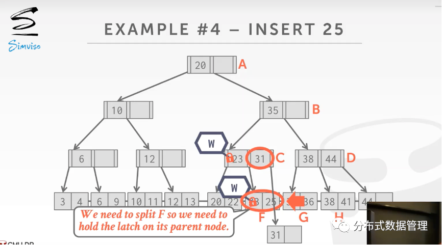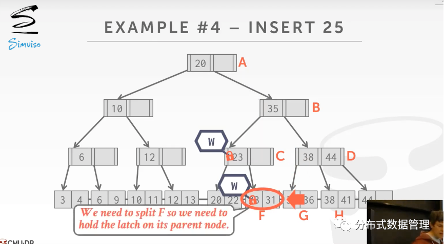 下图是处理叶节点需要分裂的例子,线程获取F的写锁后发现需要分裂,暂时不释放C上的写锁.