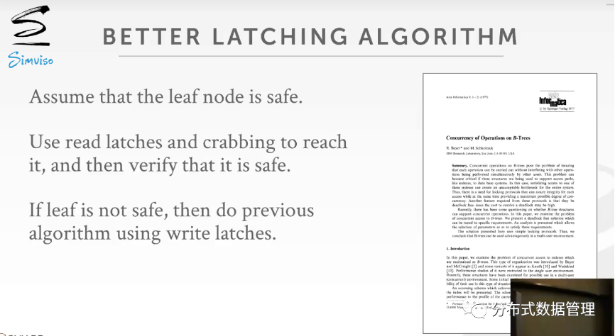 前面都是假设单个线程对索引操作,为了充分利用现代处理器多个核心以及弥补I/O延迟,讨论多线程对索引操作的相关话题. 包括Latch,Hash Table Latching,B+ Tree Latching,乐观并发,处理叶节点死锁问题,父节点延迟更新.