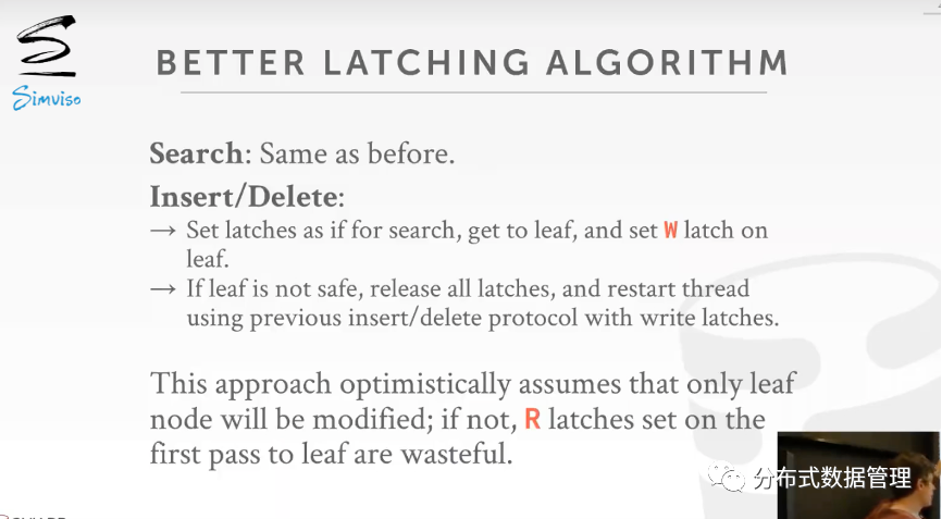 写线程若假设此次写操作不会引起节点分裂/合并,对节点优先使用读锁处理,只在确定需要修改的节点上施加写锁,这样其他线程依然可以对路径上的节点施加读锁,增加了系统并发度. 若在此过程中线程确认节点数据的更新需要节点的分裂或者合并,再使用原先的方法重新从根节点处获取路径上的所有写锁. 这是一种乐观并发的想法,在真实的低竞争率的系统中被运用的非常广泛.