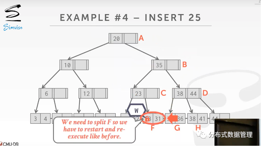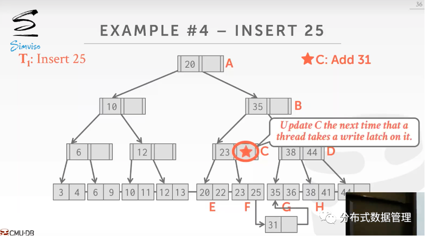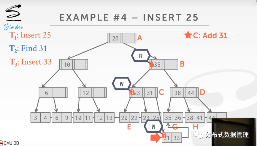 例如下图中的例子,线程1向B+树种插入Key=25的数据,更新完叶子节点后父节点留给下一个获取到写锁的线程去完成.
