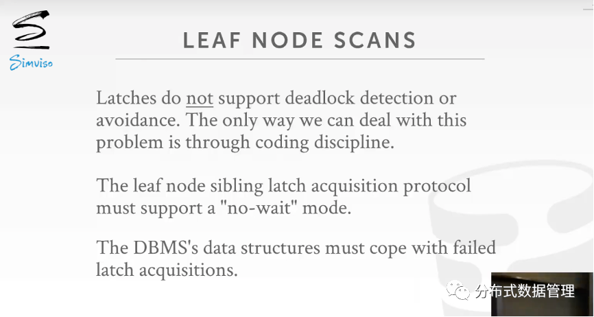 与事务不同,由于线程latch没有死锁检查方法(一个线程不知道另一个线程在做什么),只能尽可能在代码上避免死锁的发生.