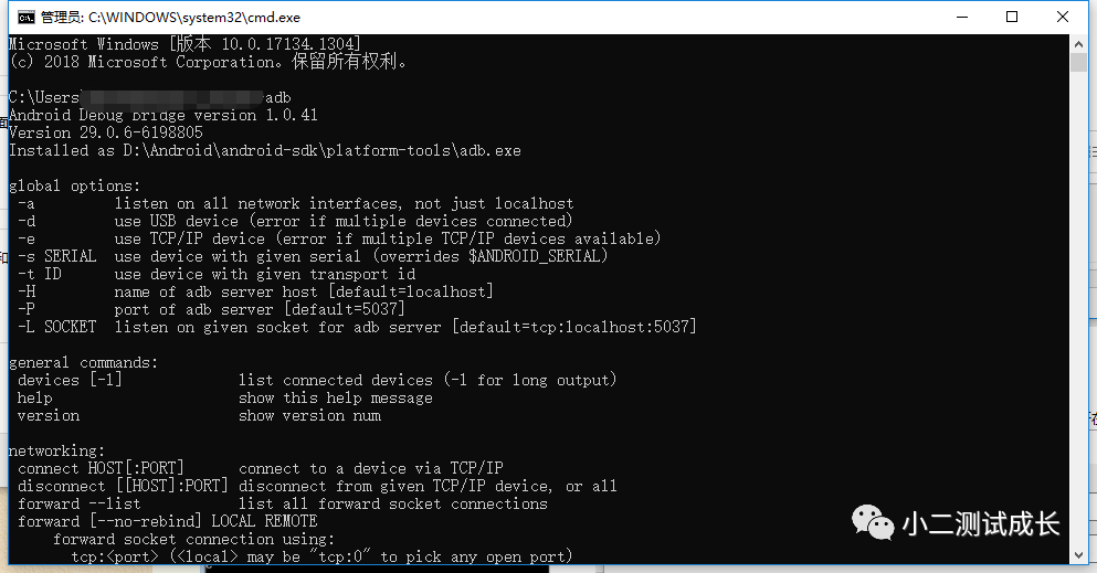 由于在platform-tools里面自带adb,所以,我么你只需要打开cmd输入adb就可以看见我们的adb版本信息了