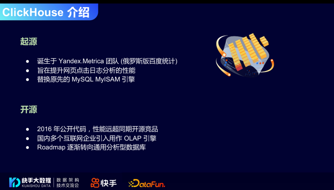 ClickHouse诞生于俄罗斯版的百度统计,旨在提升网页点击日志分析的性能,ClickHouse即ClickStream和WareHouse的统称。在2008年的时候开发出来,目的是为了替换他们原有的MySQL MyISAM引擎,并且实际应用效果很好,于是在2016年的时候进行了开源,性能远超同期的开源竞品。这时国内多个互联网企业先后引入ClickHouse用作OLAP引擎。开源社区也意识到这一问题,于是将Roadmap逐渐转向统一的、通用的分析型数据库,作为下一步的计划去做研发。