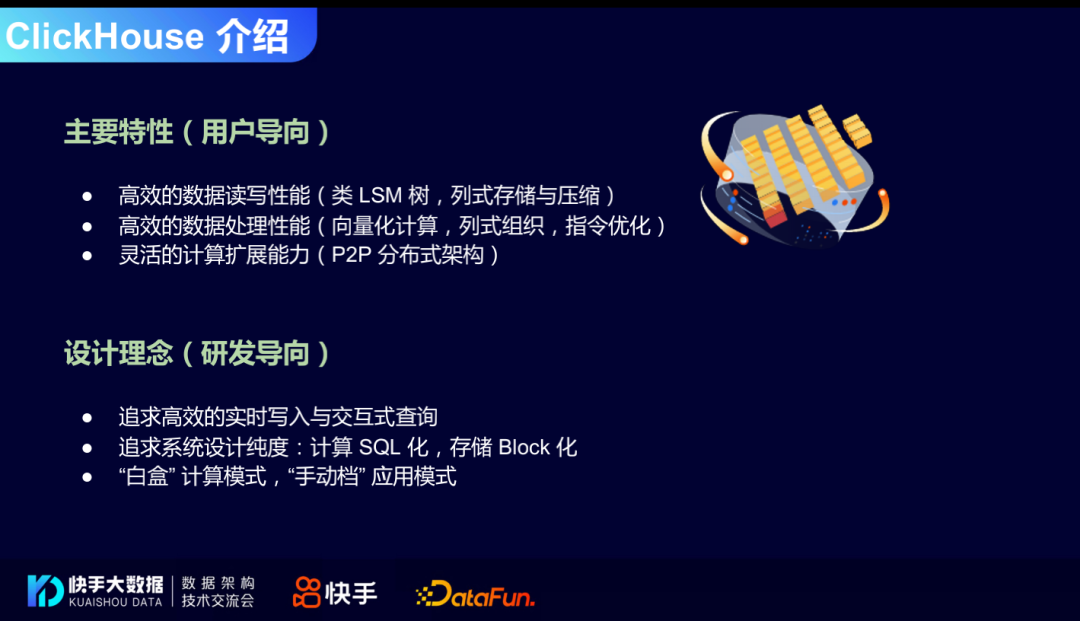 “白盒”计算模式,ClickHouse是一个非常容易做嵌入和扩展的系统,非常适合研发人员进行利用;“手动挡”应用模式,ClickHouse对于新手来说用起来还是比较费劲的,针对这个问题,快手做了一系列的服务包装和架构上的设计。