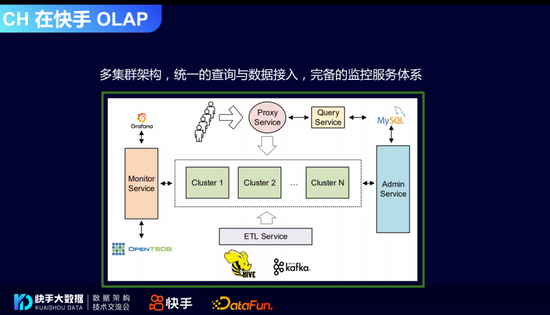 ClickHouse在快手内部是作为OLAP引擎,提供多集群架构,对于不同业务有不同的集群保障,上层是查询代理层,进行统一的查询管控和接入路由以及统一的监控服务,这样可以把ClickHouse“手动挡”应用模式逐步变成一个可用的服务,提供给用户。同时最底层的数据写入,由于ClickHouse的数据写入需要一些相关的知识,所以把ETL服务抽取出来,用户只要告诉我们,你从哪个实时流进来,或者从哪个离线的数据源过来,我们就可以提供整套的ETL服务进行包装。