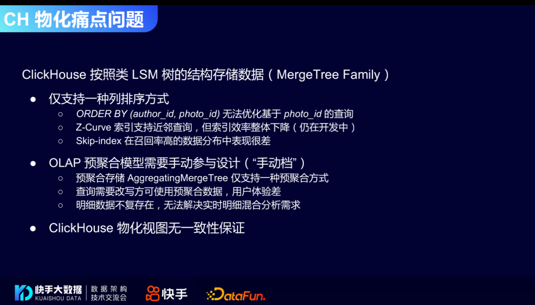 剩下的物化存储特性是 OLAP 分析的一个强需求。ClickHouse 缺乏生产可用的物化视图功能,亟需解决。