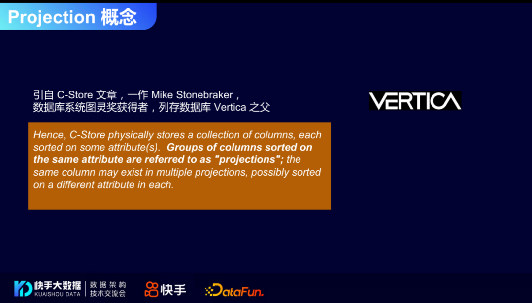 Projection是一组列的集合,用建表语句可以定义,这个概念在C-Store提出后,他们成立了一个公司叫Vertica,做列存数据库,Projection在Vertica数据库中落地发展,不仅仅是按照不同的顺序做存储,同时还支持部分的聚合函数,比如sum、min、max以及一些上卷的优化,可以通过Projection的机制来完成。