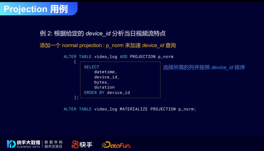 在实际应用案例中,会有这样的场景:一个用户,在行为表中,可能会有多种口径的查询方式,比如user_id, phone_num, device_id, 不同的人会通过不同的方式去查,这样在取数的时候,通过一维的排序肯定是不够的,如果通过稀疏索引或者二级索引也会带来其他的问题。如果用Projection的话,可以根据不同的口径,选出需要的列,进行异构多序存储,这样就可以针对不同用户的取数口径,都能够达到提速的效果。