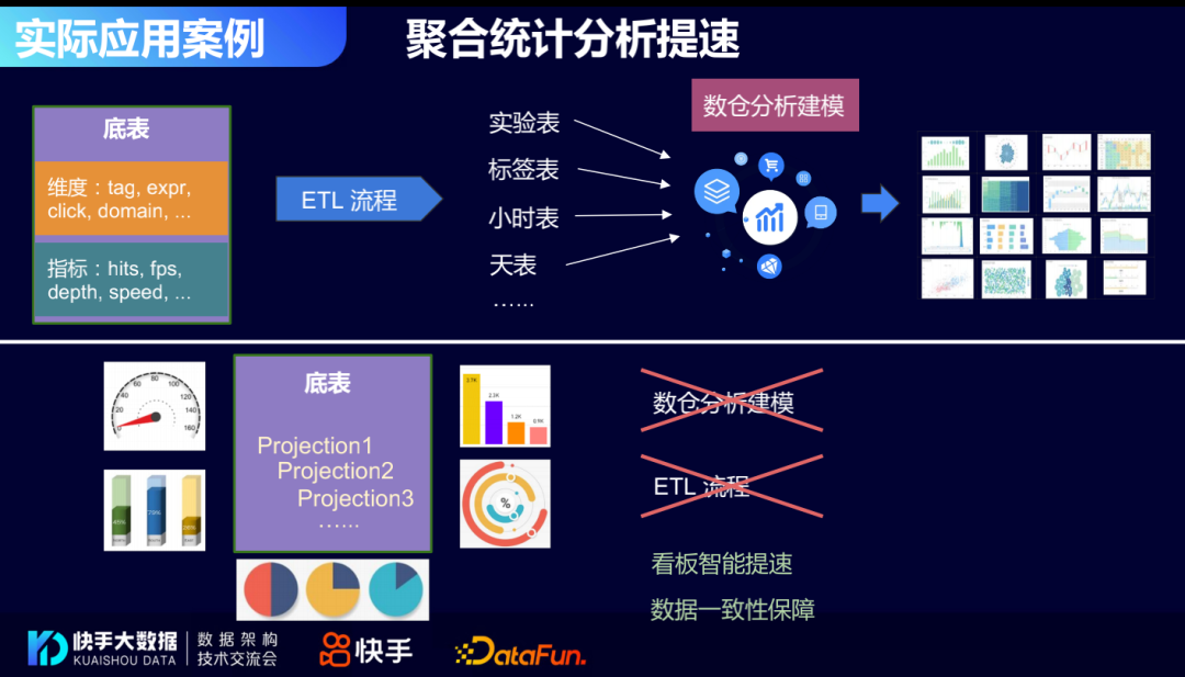 当我们要做一个聚合统计分析提速,有一张底表,会有一系列的维度和指标,正常情况下,需要提速的过程是一个ETL流程,我们需要为每一个不同的Topic准备一些特殊的表如:实验表、标签表等,然后进行分析建模。而有了Projection之后,可以把这些步骤都省略了,针对底表,我们可以根据end to end去看报表,看看数仓需要哪些查询,我们做一些分析,把这些查询汇总、归一,建几个Projection,这样所有的报表看板就及时生效了,省去了之前的ETL流程和数仓建模的过程,使看板智能提速;并且由于我们只使用了底表,原始明细数据都在,保障了数据一致性。