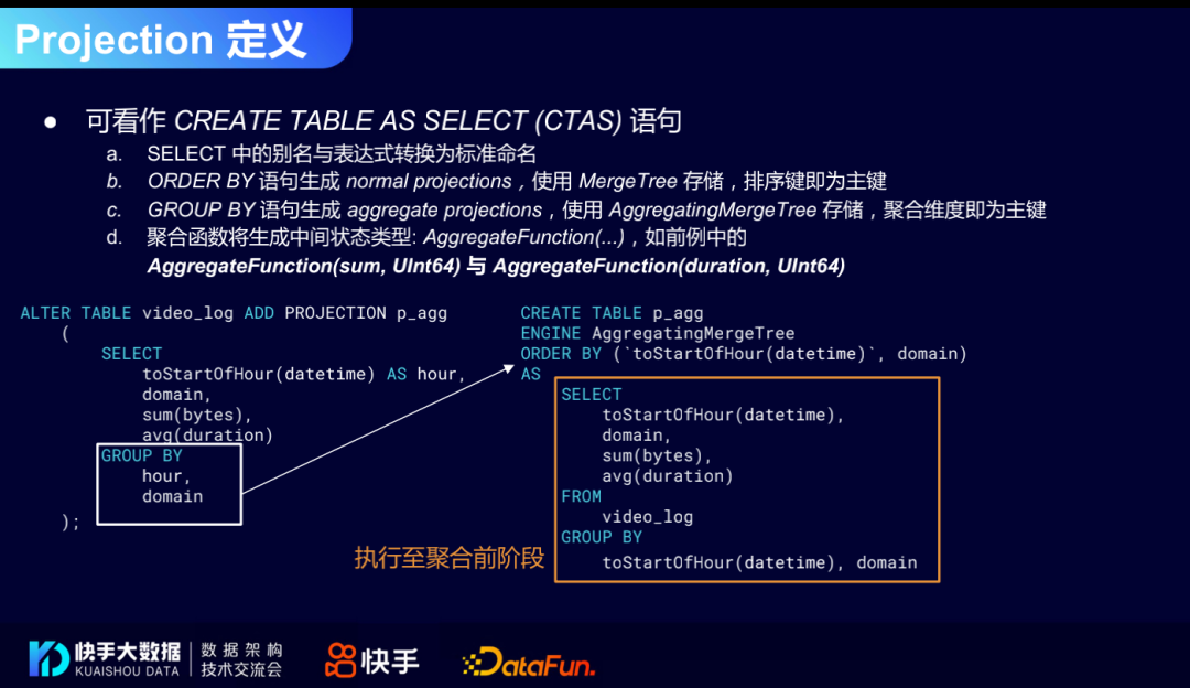 可直接通过待优化的查询进行定义,用户要优化一个查询,可以把查询丢给Projection,做一些中间阶段的预聚合,并且预聚合的过程能够自动泛化匹配其他查询