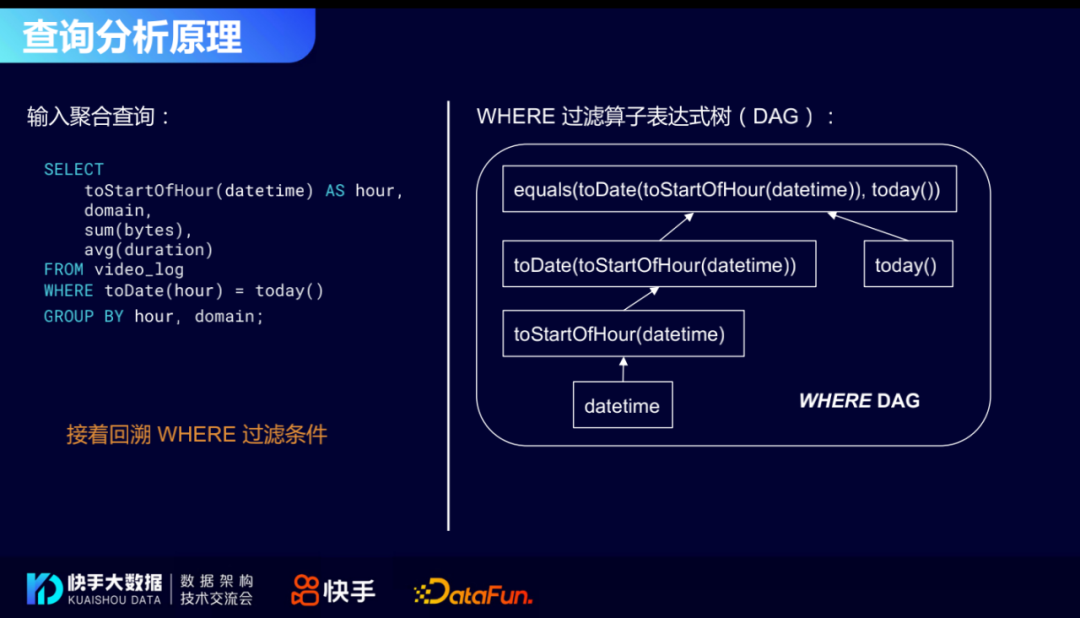 这里有一个WHERE执行树,WHERE执行树本质上是一个DAG表达式,它表达的意思是:现在有一组列,这一组列怎么样通过不断的变换形成新的列,最后产生一个谓词equals,判断这个谓词是真还是假。