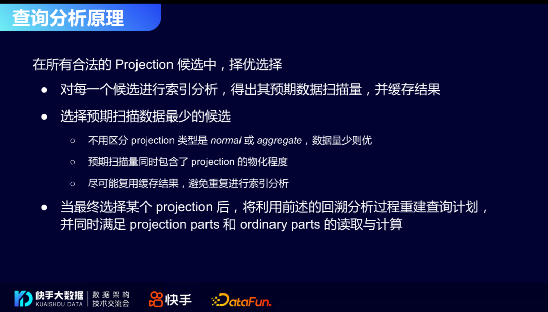 找到有效命中的Projection之后,要在所有合法的Projection候选中,找到其中最优的方式。因为Projection涉及到很多方面:一个是类型多,有Normal Projection、Aggregate Projection,在同一个查询里都有可能命中;同时Projection是个lazy的概念,可能不同的Projection物化程度并不一样,怎么样能够有效地发现哪一个Projection是最好的?这时候我们可以对每一个候选进行索引分析,得出其预期数据扫描量,并缓存结果,这样就能有效的判断这个Projection是好还是不好。这样只需要选择预期扫描数据最少的Projection,不用区分Projection类型是normal还是aggregate,只要读取的数据量少,计算量肯定也少,那么一定是最优的。预期的扫描量包含了Projection的物化程度。然后再把整体的索引分析的结果进行复用,避免重复的进行索引分析。当最终选择某个Projection之后,将利用前述的回溯分析过程倒推Projection所需要的执行管道,再把Projection的执行逻辑和normal的执行逻辑进行合并,得到一个最终的管道,使得查询在任何时刻、Projection的任何物化程度下,执行结果都是一致的,这样就实现了前述的一致性的问题。