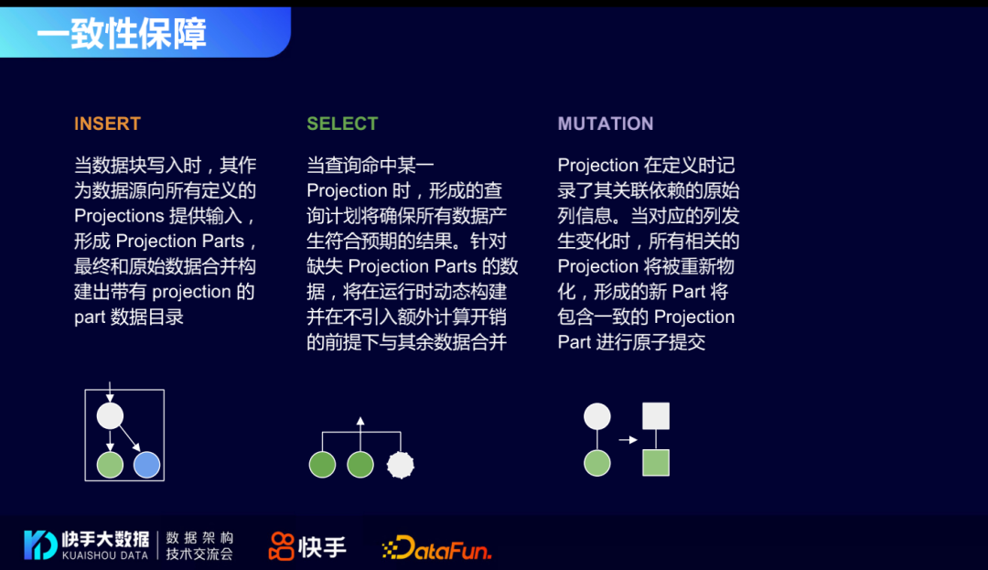 Projection存储:Projection存储主要就是解决一致性的问题,怎么样在ClickHouse物化视图不一致的情况下,通过存储的设计,把物化出来的结果和原始的结果进行强一致的绑定。