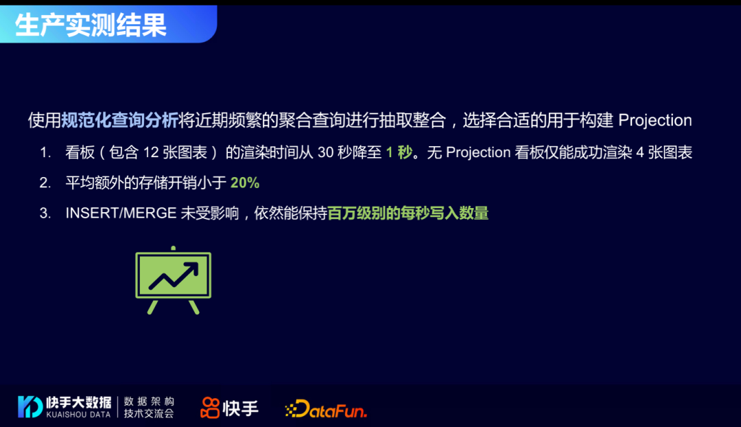 ClickHouse所有的查询信息都是白盒的,所有东西都提供规范化的查询分析,每个查询带有一种去掉所有的literal,就是字面量。去掉literal之后,我们可以做规范化的查询,可以每天去看一下查询日志里面聚合函数分别有哪些能够命中,然后我们得出值得建哪些查询的物化,建出来之后,去找一些看板来看,基本上一个看板,比如12张图表,原来渲染时间要30秒,等半天才出来4张图表。加了Projection之后,1秒就出来了,体验感非常好。统计Projection所有的开销,其实存储开销还是比较少的,刚才说的,聚合效果足够的话,存储开销不多,大概20%。同时,写入还有MERGE并没有观测到可见的影响,同样能够保持百万级别的每秒写入数量。