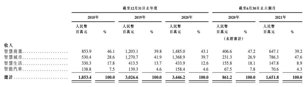 2020年智慧商业收入14.9亿元,占比43.1%;智慧城市收入13.7亿元,占比39.7%;智慧生活收入4.3亿元,占比12.6%;智慧汽车收入1.6亿元,占比4.6%。