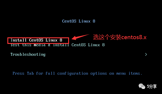当系统从 CentOS 8.4 ISO 启动介质启动之后,就可以看到以下这个界面。选择“Install CentOS Linux 8”(安装 CentOS Linux 8.4)选项并按回车。