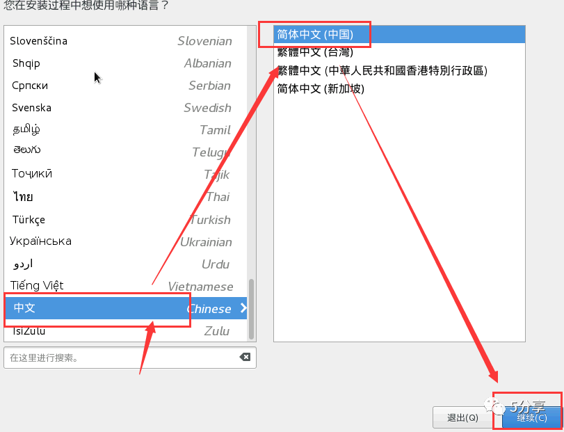 选择想要在 CentOS 8 安装过程中使用的语言,然后继续。