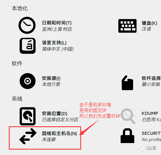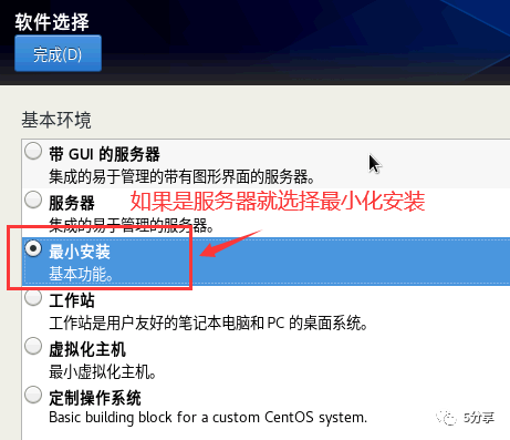 在软件选择选项中选择安装的模式。例如“包含图形界面Server with GUI”选项会在安装后的系统中提供图形界面,而如果想安装尽可能少的额外软件,可以选择“最小化安装Minimal Install”。