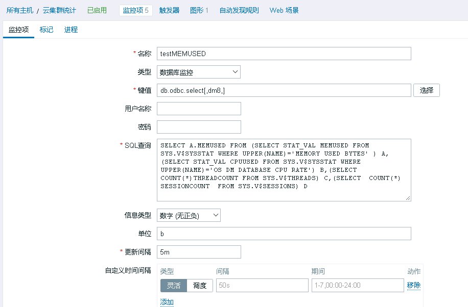当然通过传统的这种方式一次只能获取一个监控项数据效率比较低,但ZABBIX4(我使用的是ZABBIX5)以后的版本提供了“Dependent items”,我们可以通过一个SQL语句获取较多的监控项,然后从它生成有关监控项数据,如果有需要后面我们定义达梦数据库监控模板将使用该方式,这里仅抛砖引玉,仅为学习使用达梦数据库。